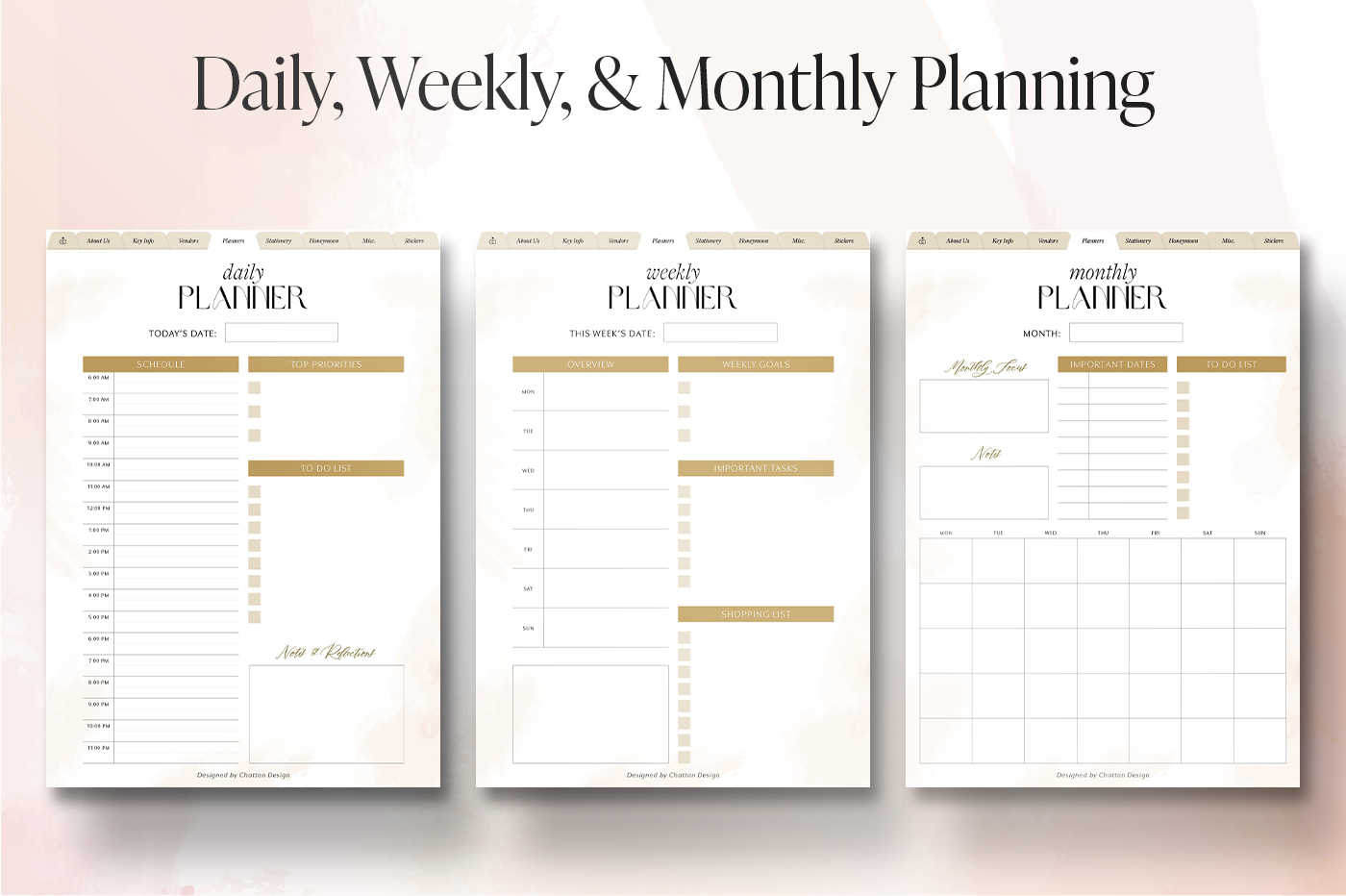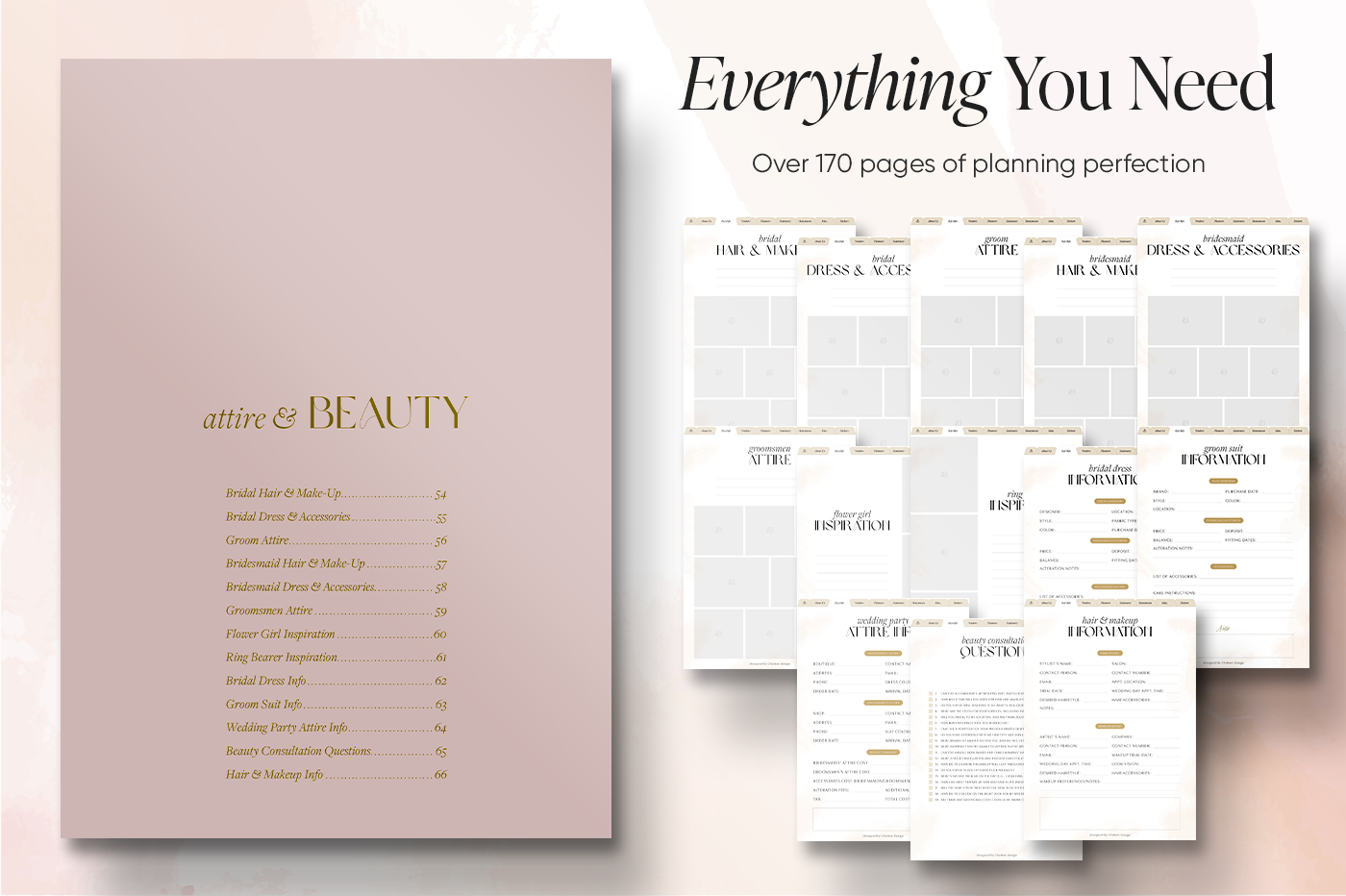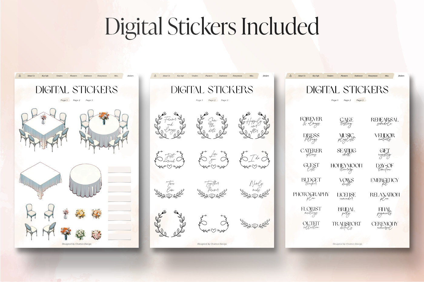 Discover the ultimate wedding planner: 179 pages of meticulously designed templates, over 170 to craft your perfect day, complemented by 49 original digital stickers. This fully hyperlinked planner ensures seamless navigation through daily, weekly, and monthly templates, plus 5 unique notepaper designs. It’s your all-in-one solution to plan, organize, and celebrate the wedding of your dreams with unparalleled ease and elegance.