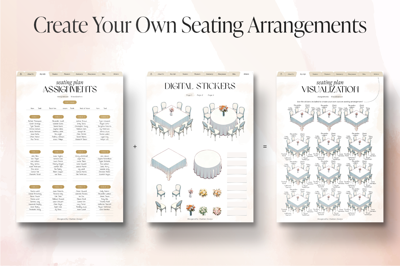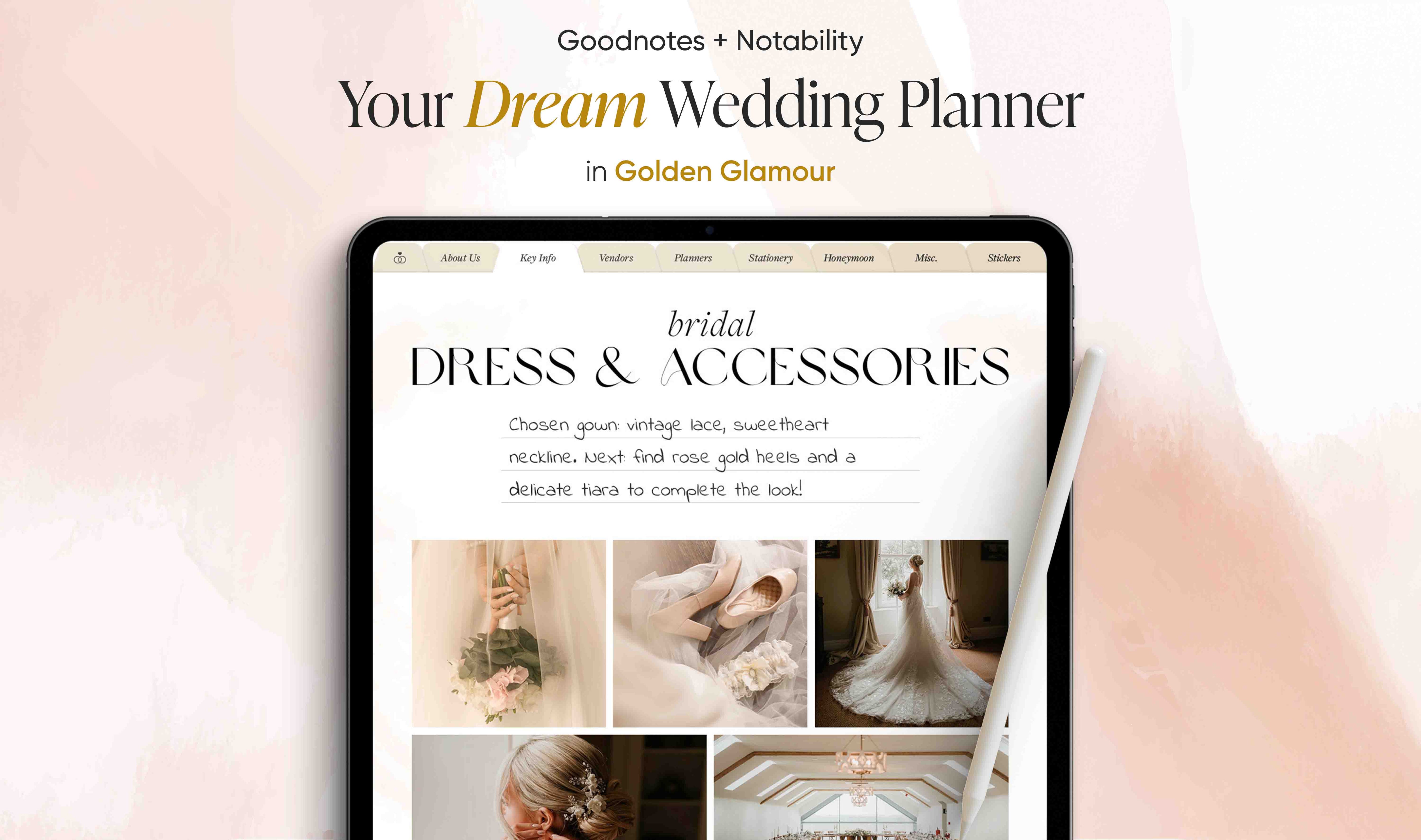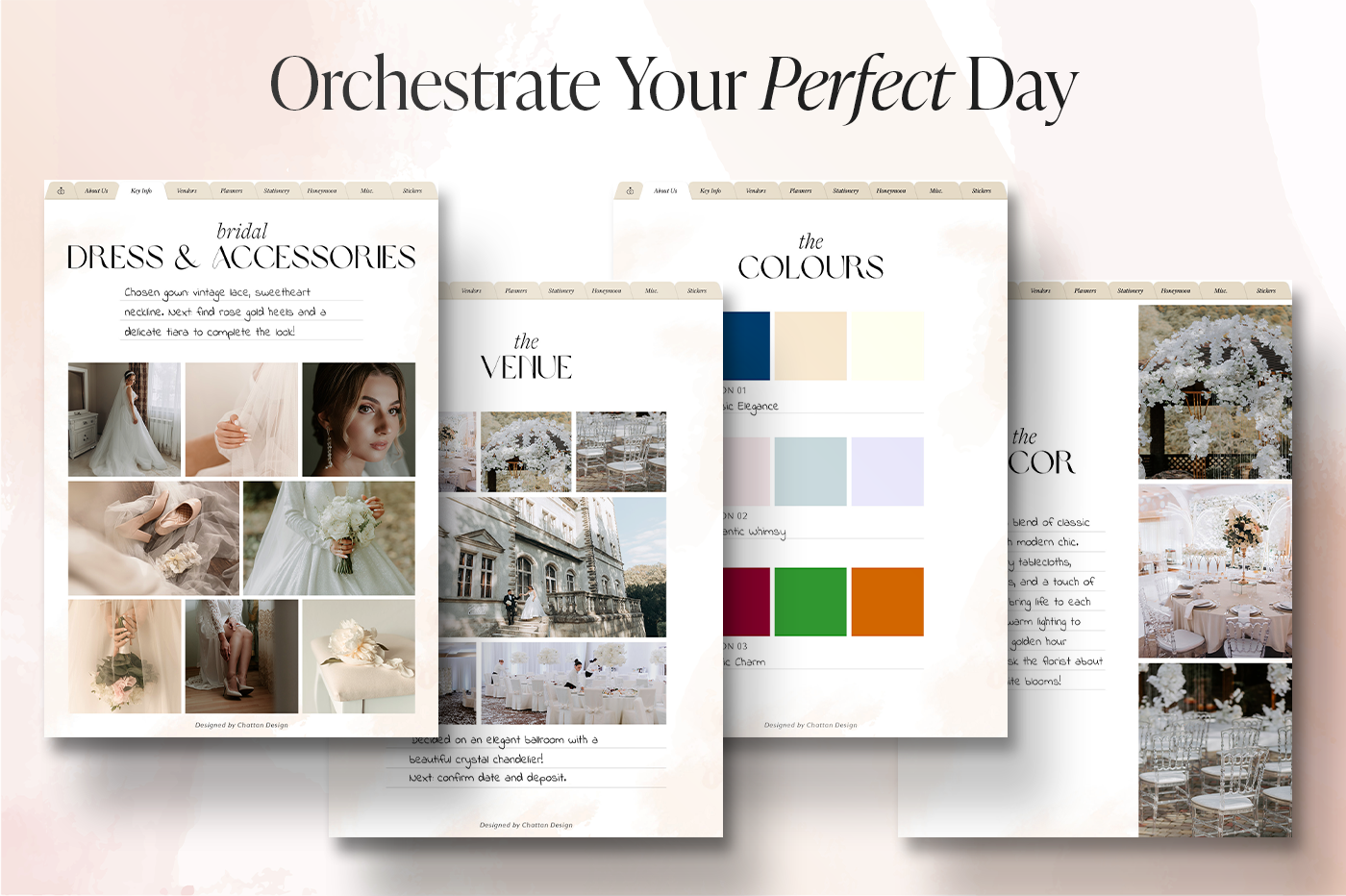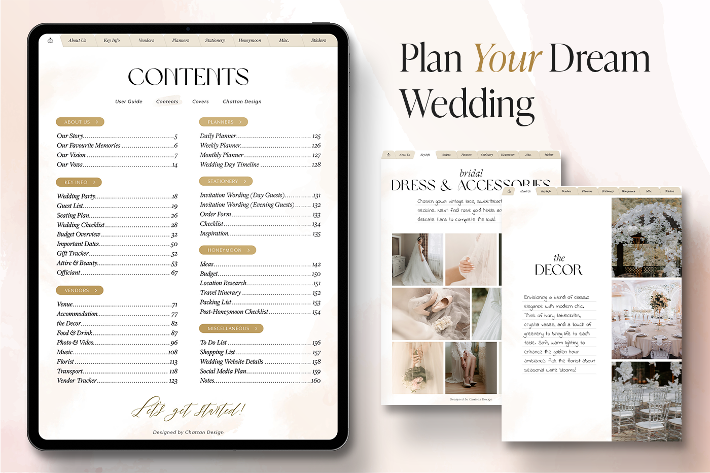 Discover the ultimate wedding planner: 179 pages of meticulously designed templates, over 170 to craft your perfect day, complemented by 49 original digital stickers. This fully hyperlinked planner ensures seamless navigation through daily, weekly, and monthly templates, plus 5 unique notepaper designs. It’s your all-in-one solution to plan, organize, and celebrate the wedding of your dreams with unparalleled ease and elegance.
