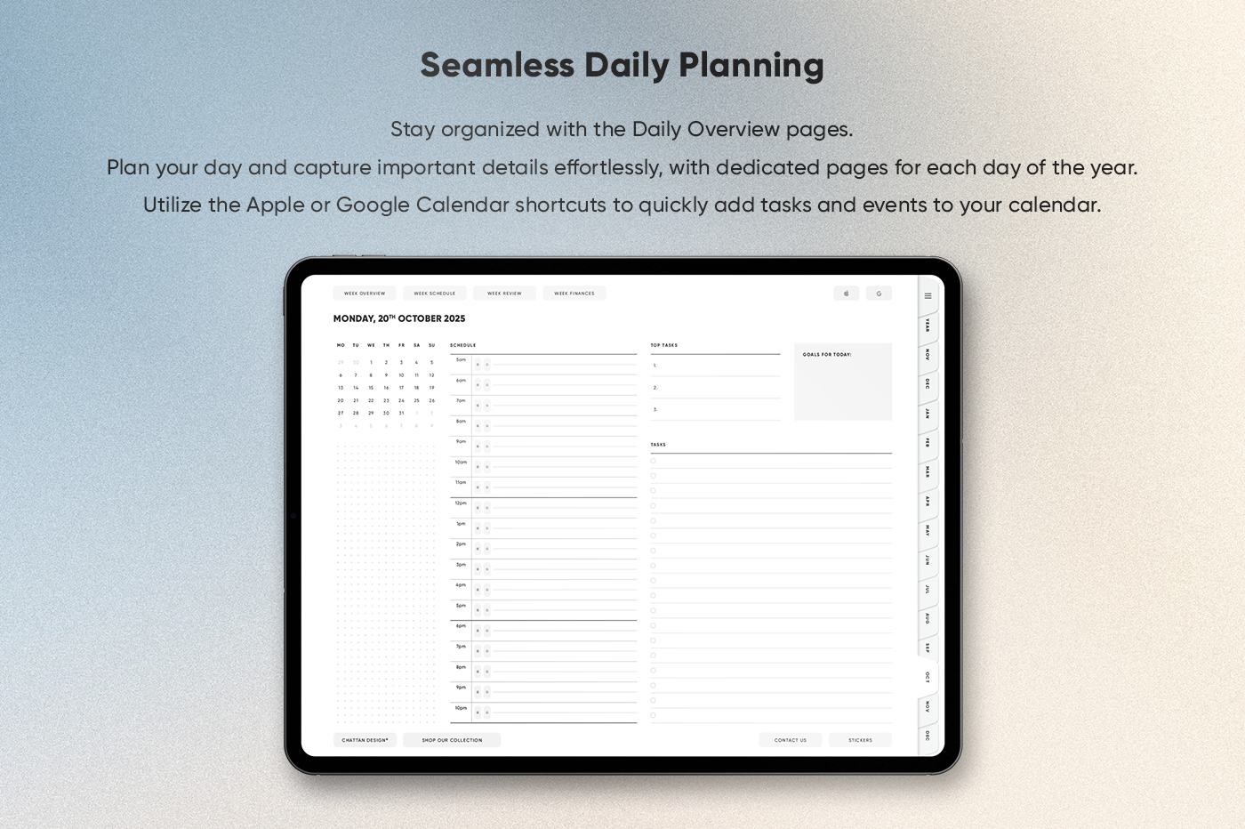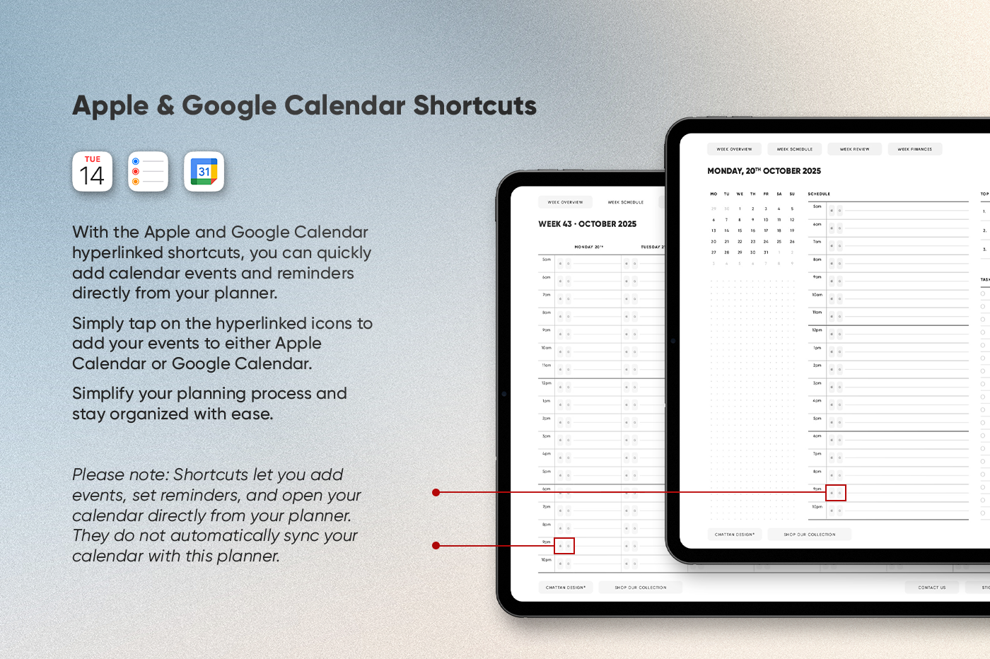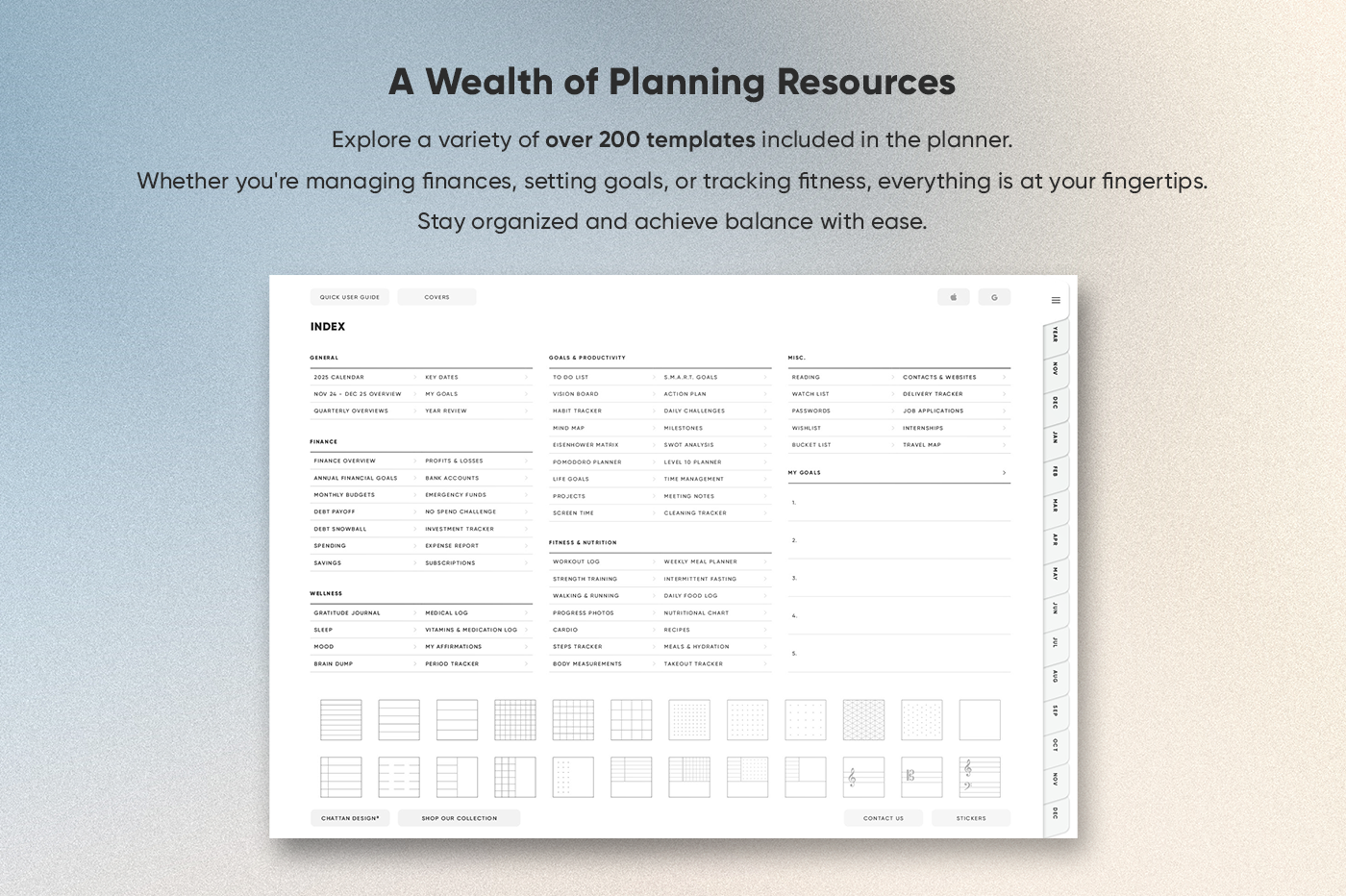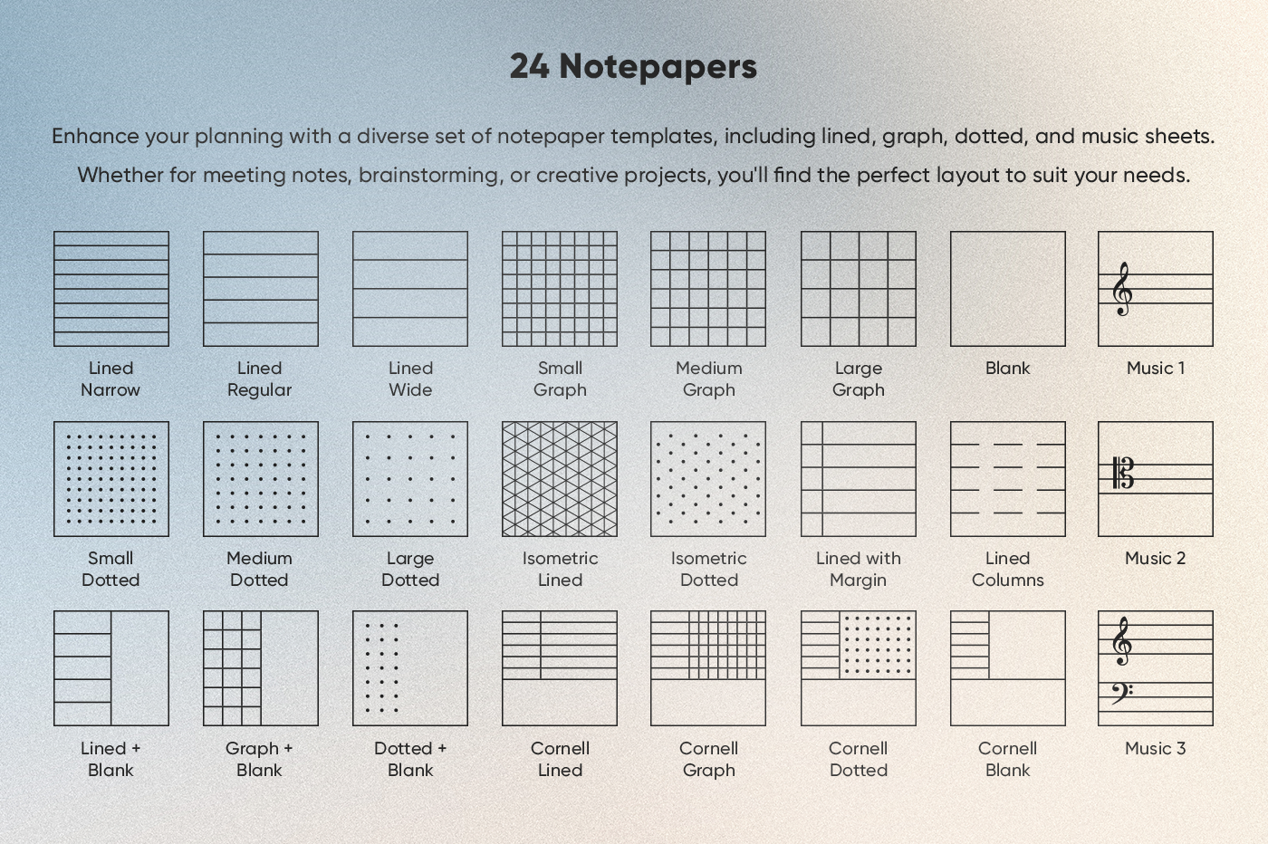 The planner includes over 200 extra templates for finance, wellness, fitness, goals, and productivity, plus 24 versatile notepapers such as music sheets, lined, graph, and Cornell notes. Fully hyperlinked for easy navigation, it also includes Apple and Google calendar shortcuts for quick access.