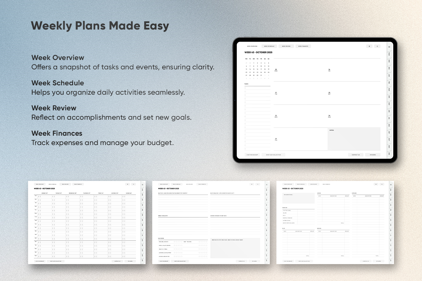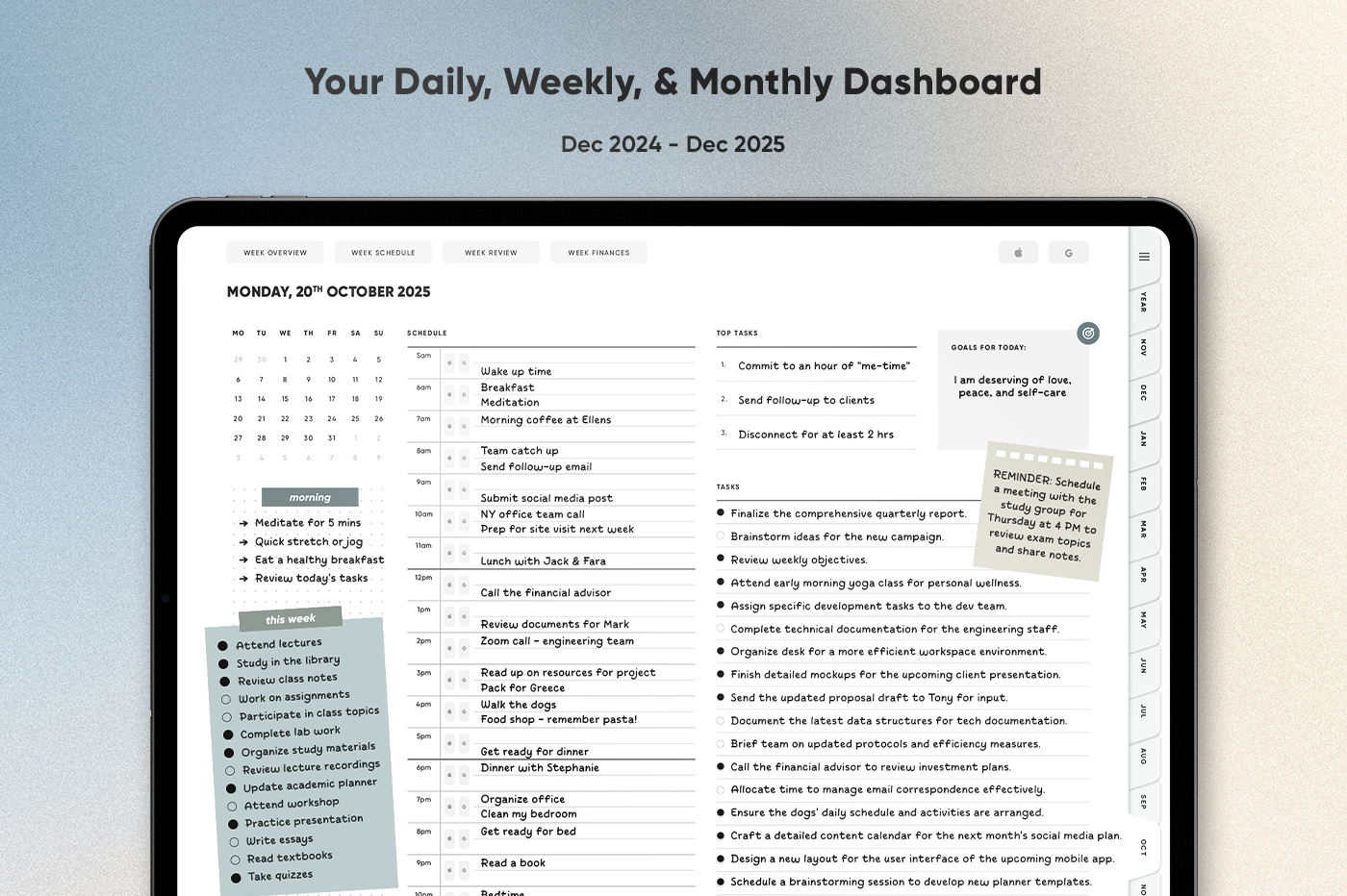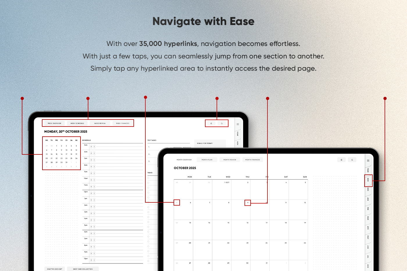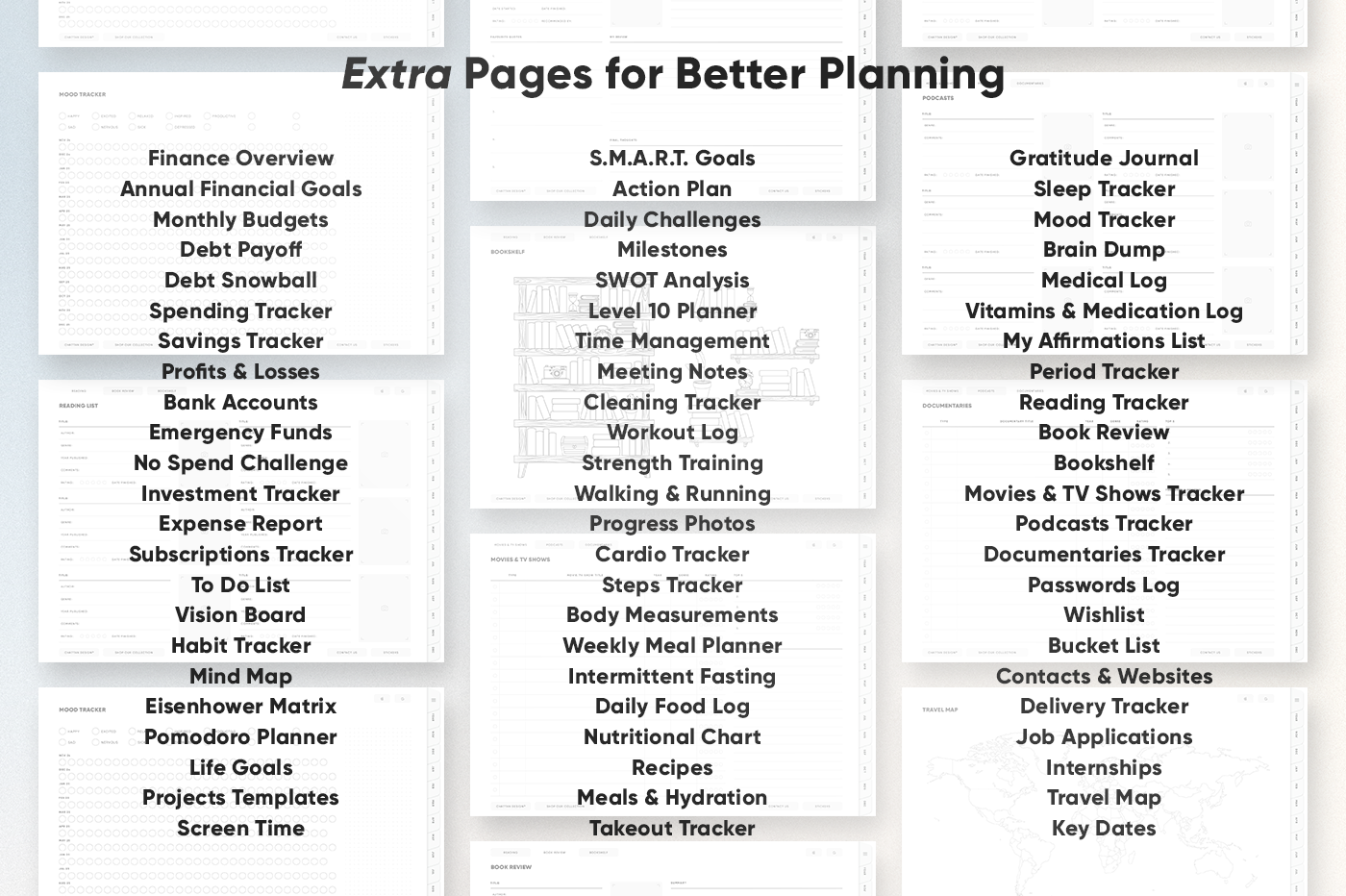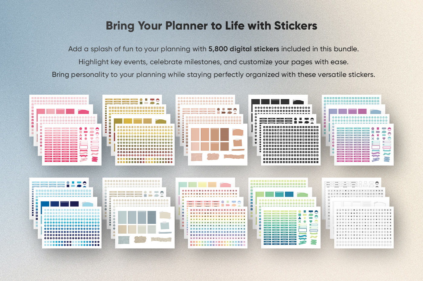 The planner includes over 200 extra templates for finance, wellness, fitness, goals, and productivity, plus 24 versatile notepapers such as music sheets, lined, graph, and Cornell notes. Fully hyperlinked for easy navigation, it also includes Apple and Google calendar shortcuts for quick access.